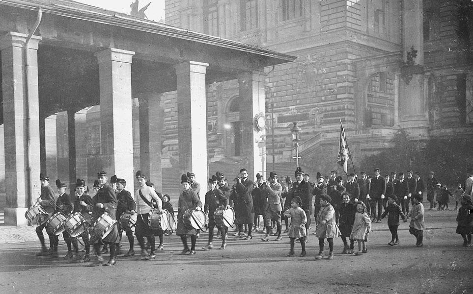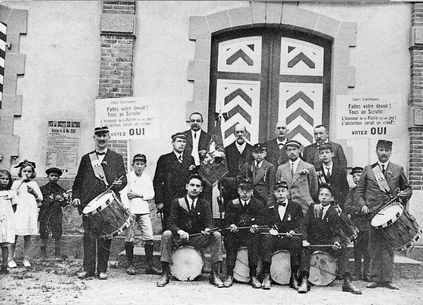 Ce groupe de tambours de collégiens de Lausanne, photographié devant l'ancien stand de tir de la Pontaise, parcourait les rues pour battre le rappel des citoyens pour voter OUI à l'entrée de la Suisse dans la Société des Nations, le 16 mai 1920. | |||||||||||||||||||||||