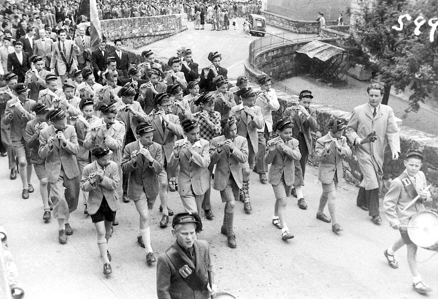 Extrait de l'Ă©volution du Corps1928-1929 : A cette Ă©poque, le Corps des fifres des deux Collèges (Classique et Scientifique) rĂ©unissait seulement 8 membres... mais qui Ă©taient d'excellents musiciens... 1930-1932 : L'ambiance fut diffĂ©rente. Les responsables Ă©taient moins perfectionnistes. Le nombre d'Ă©lèves admis au Corps, avec le galon sur la casquette, augmenta rapidement. Le programme des marches fĂ»t rĂ©duit, probablement inconsciemment pour l'instructeur, mais tout cela se concrĂ©tisa, dans la rĂ©alitĂ©, par un corps permanent de 20-30 Ă©lèves. C'est l'Ă©poque de l'introduction des marches de Bâle (90 pas Ă la minute et du fameux cahier des Alte Schwyzer Marchen) pour les occasions de concerts, indĂ©pendamment des dĂ©filĂ©s. CĂ´tĂ© tambours, une mĂ©thode originale (courante dans les fanfares de l'armĂ©e Ă l'Ă©poque) fut introduite consistant Ă Ă©crire les coups de baguette gauche ou droite, les "flas" et les "ras" ou roulements dans des carrĂ©s successifs par signes conventionnels. Cette mĂ©thode de lecture ne donne pas le rythme, qui s'apprenait par cœur. Comme il s'agissait toujours de marches, c'Ă©tait assez rapidement acquis. Ainsi, il n'Ă©tait pas nĂ©cessaire d'apprendre le solfège pour jouer du tambour au Corps des fifres des Collèges. 1933 Ă 1950 : L'instructeur essaie de complĂ©ter le programme un peu dĂ©suet bien qu'Ă©tant composĂ© de valeurs sĂ»res et traditionnelles (marches de Diesbach, Larifla, Dornach, Fanfan-la-Tulipe, les Armourins, etc.). Il compose une marche "des Plumets Rouges", des introductions Ă des airs populaires comme "Auprès de ma Blonde", "La Rose au BouĂ©" et adapte au fifre une marche des grenadiers, Ă©crite pour fanfare des troupes napolĂ©oniennes. Le Corps des fifres se porte bien, en permanence une trentaine d'Ă©lèves en moyenne. Les jeunes Ă©lèves, aspirant au galon, assurent la relève des partants de 16 ans. Certains, peu nombreux, rejoindront Merula, d'autres poursuivront des Ă©tudes de flĂ»te, dont Bossard, le fils du peintre, qui sera professeur au Conservatoire de Berne, et flĂ»te-solo de l'Orchestre de la Ville. D'autres sont devenus des personnalitĂ©s de la vie politique ou culturelle du Pays de Vaud. Citons Jean-Pascal Delamuraz, Jacques Chessex, l'ingĂ©nieur J. Boss, syndic de Renens, les frères Vurlod, dont l'un sera juge cantonal, les avocats Georges Derron, Foetisch, Claude Perret, chirurgien et doyen de la FacultĂ© de mĂ©decine, et tant d'autres. La vie du Corps des fifres se dĂ©roule selon un rythme quasi immuable, au grĂ© de celle des Collèges cantonaux. Promotions au printemps pour le "Scienti", en juillet pour le Classique, avec prise du drapeau. Cortège jusqu'Ă l'Eglise de Saint-François dès la Mercerie, jusqu'Ă la CathĂ©drale dès le Valentin, ou dès le nouveau Collège Classique Cantonal Ă l'avenue de BĂ©thusy en 1937. Port de la casquette obligatoire. Il y avait aussi, en juillet, les cortèges de la FĂŞte du Bois des Ă©coles primaires de la Commune de Lausanne, suivie de celle des Collèges oĂą la montĂ©e de la route du Pavement jusqu'Ă Sauvabelin essoufflait les fifres Ă tel point qu'il fallait Ă©courter les marches pour arriver au but. Mais pas question de renoncer Ă jouer Ă cette occasion ! | |||||||||||||||||||||||