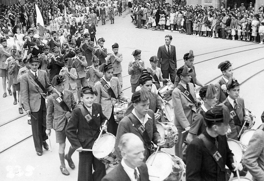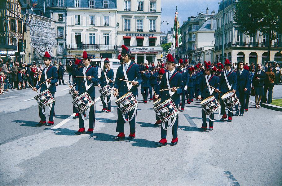 Le premier uniforme1954. Tir fédéral à Lausanne-Ecublens. Cette manifestation attire beaucoup de monde. Frédy Haldy, directeur de la Fanfare, est en relation constante avec tous les corps de musique de Lausanne, voire du Canton. Il est le fournisseur quasi permanent de channes ou plateaux en étain récompensant les lauréats de concours (tir, gymnastique, etc.). Il fait engager par les organisateurs du Tir fédéral la Fanfare des Collèges, qui devient quasiment le corps de musique officiel du Conseil d'Etat. Il faut se présenter en uniforme. Ce qu'il réalise. Dès lors, la Fanfare apparaît en uniforme à toutes les manifestations des Collèges. Cette fois, c'en est trop ! Le Corps des Fifres et Tambours fait figure de parent pauvre avec ses chemises blanches, en été seulement. Les élèves ont un sentiment de frustration. Bien qu'il ne soit plus instructeur, Emile Matthey propose à Pierre Renaud d'intervenir directement auprès du Département de l'Instruction Publique, dont le Conseiller d'Etat en charge est Pierre Oguey. Emile Matthey le connaît bien, ayant été son élève à l'Ecole d'ingénieurs de Lausanne, devenue EPUL, puis EPFL, alors qu'il y était professeur avant d'entrer en politique et d'accéder au Gouvernement vaudois. Le rendez-vous est rapidement pris. Pierre Oguey est sensible aux arguments développés. Il accorde spontanément un crédit de fr. 10'000.– à ce projet à condition qu'un appoint soit apporté, ce qui sera assez rapidement réalisé par les Anciens. Par souci d'homogénéité, l'uniforme est le même que celui de la Fanfare, sauf que ce qui est blanc pour la Fanfare (plumets, guêtres), est rouge pour les Fifres et Tambours. |