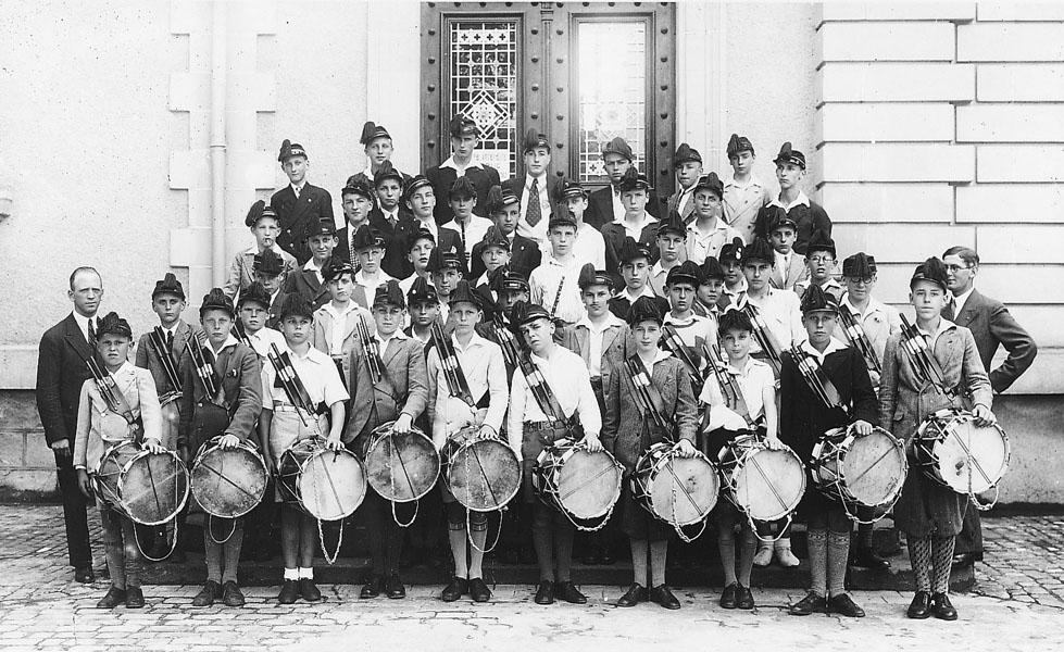 Dès 1808, sous l'influence napoléonienne, les élèves du Collège académique sont astreints à des exercices militaires et au port d'un uniforme. La création d'une batterie de tambours et d'une fanfare date de la loi sur l'Académie et les Collèges classiques de 1837. Les fifres ne semblent pas avoir eu d'existence indépendante, ainsi qu'en témoigne ce passage de Découverte du Monde de C.-F. Ramuz, entré au collège en 1887 : "J'avais une casquette à olive verte et blanche : les collégiens d'aujourd'hui continuent à la porter. J'ai eu plus tard un uniforme dont les collégiens d'aujourd'hui ont perdu sans doute jusqu'au souvenir, avec un pantalon gris de fer, une tunique bleu sombre à boutons dorés, un ceinturon dont la boucle de fermeture, dorée également, était une reproduction de l'écusson cantonal ; et la fanfare avait un plumet blanc et les tambours un plumet rouge. C'était le Corps des cadets." Les cadets sont supprimés à Lausanne en 1897. Nostalgique, mais sans vouloir ni pouvoir les ressusciter, le directeur du Collège Classique Cantonal, Edouard Payot, qui aime les célébrations, les manifestations collectives et la tenue, prend l'initiative de fonder en 1902 un groupe de fifres et de tambours qui réunit les élèves du Collège classique et de l'Ecole industrielle. Il n'est plus question d'uniforme ; les musiciens portent sur la casquette une lyre, "emblème un peu ironique de notre spécialité" note M. Combe, un des premiers fifres. Les plumets rouges, autre souvenir des cadets, apparaissent une dizaine d'années plus tard. Le Corps se montre pour la première fois lors du Festival vaudois de 1903. |