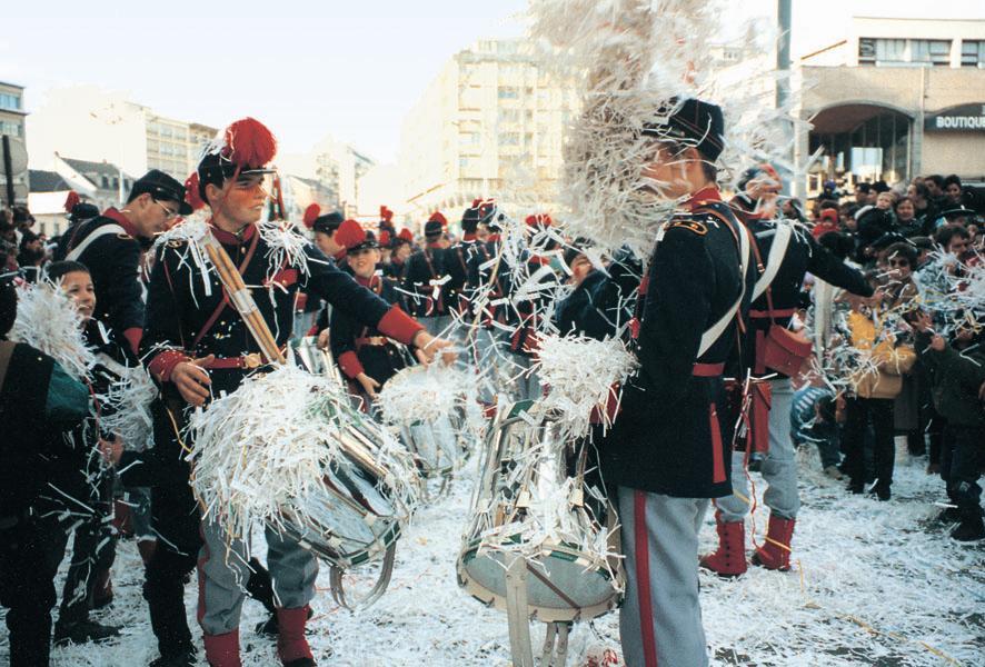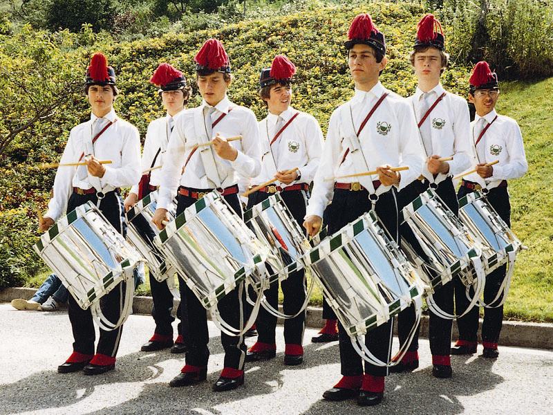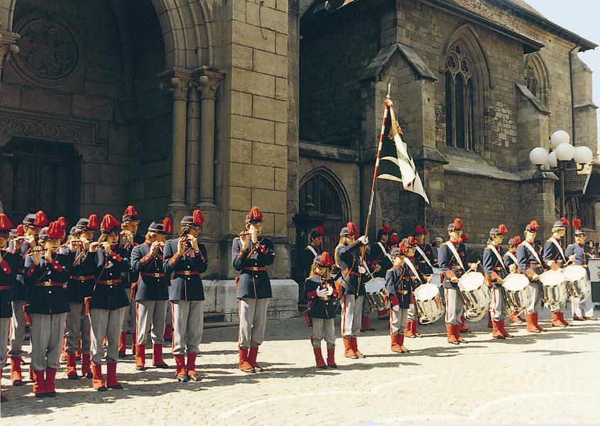 1982 - Le nouvel uniformeUne plongée dans les archives nous apprend que c'est en 1979 qu'est donné le coup d'envoi pour le renouvellement des uniformes du Corps. Le 3 juillet 1980, une petite cellule de travail s'attaque à la réalisation de projets. C'est l'époque où fanfares et autres groupes costumés sont lassés des uniformes impersonnels et optent pour une présentation plus chatoyante. Or, c'est dans le passé qu'il faut chercher la fantaisie, la couleur. Il était donc tout naturel de se tourner vers le passé des Fifres et Tambours, c'est-à -dire vers les Cadets qui eux, portaient un uniforme militaire. L'aquarelle de Louis Curtat, montrant les Cadets défilant dans les rues de la Cité, (Musée historique de l'Ancien Evêché, Lausanne), ainsi que les gravures retrouvées au Musée de Morges, vont servir de base à la conception du nouvel uniforme du Corps des Fifres et Tambours des Collèges lausannois. L'étude de ces documents nous indique que filles et garçons pourraient très bien avoir plaisir à porter un tel habit. Il y a continuité, puisque les collégiens de 1980 portent la casquette que les Cadets des années 1840 arboraient déjà et dont C.-F. Ramuz, entré au collège en 1887 donne la description: "J'avais une casquette à olive verte et blanche". Le processus a ainsi commencé par quelques études dessinées, puis bricolées sur mannequin pour définir une version actualisée de l'uniforme des Cadets. La réalisation définitive a ensuite été confiée à la Maison Schild. Tout ce travail de recherche et d'exécution était passionnant. Il fallait bien sûr que cette nouvelle tenue soit séduisante pour le public, que le groupe prenne fière allure, que ce soit pratique pour les voyages et que les jeunes d'aujourd'hui aient plaisir à l'endosser. Vint enfin le 15 mai 1982. Quel bonheur de voir ce nouvel uniforme prendre vie, de la taille Petit Poucet jusqu'à la taille adulte !